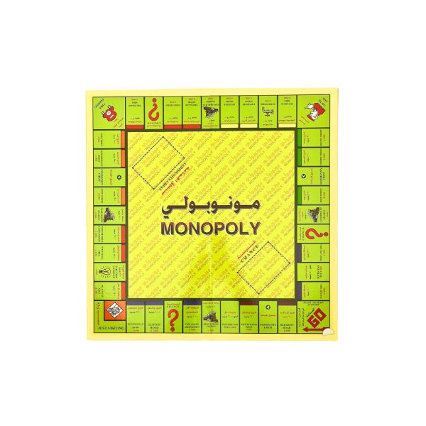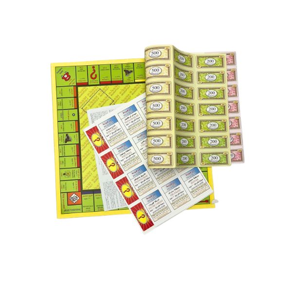لوحة لعب الخشبية -بيادق للعب من الوان مختلفة -نرد – بيوت وفنادق- بطاقة سند تمليك – بطاقة فرصة – بطاقة صندوق الجماعة